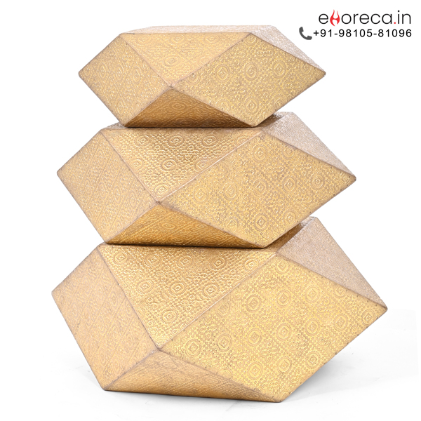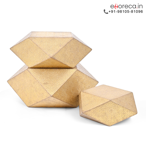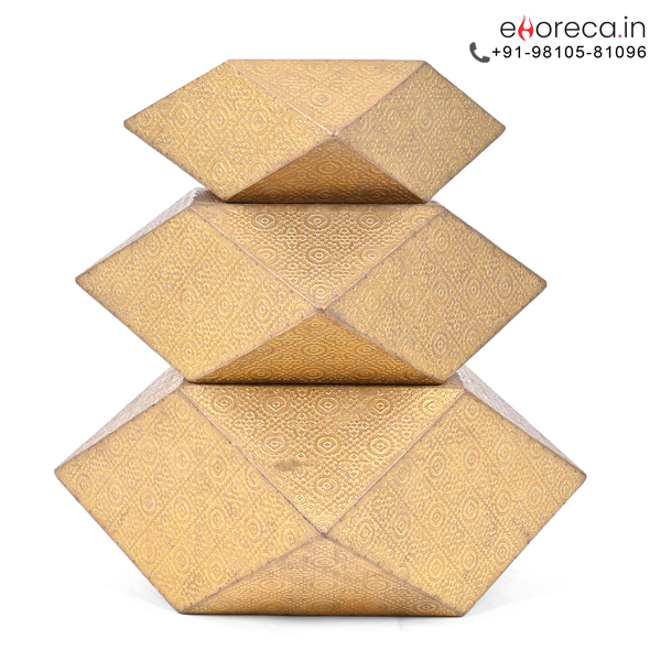 We combine natural wood with metallic artistry in this Buffet Diamond Riser Set. The internal wooden structure ensures incredible strength for heavy serving platters. Meanwhile, the outer brass sheet provides a brilliant and reflective golden glow. This combination results in a sturdy yet lightweight tool for event planners. You can easily transport the entire set between different hospitality functions. The material resists warping even when placed under intense buffet lighting. It represents the perfect harmony between functional utility and high-end decor style.