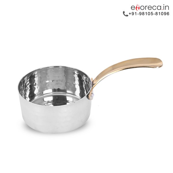 The Stainless Steel Serving Sauce Pan With Brass Handle transforms your dining table into a luxury culinary stage instantly. Skilled craftsmen shape each piece from high-grade stainless steel to ensure a lifetime of rust-resistant service. You will immediately notice the beautiful handcrafted hammered texture on the exterior surface. This deliberate finish effectively hides minor surface scratches while maintaining a brilliant mirror-like luster. Furthermore, the elegant golden-toned brass handle provides a striking visual contrast against the polished silver metal. Transition words help explain why this specific vessel belongs in your professional restaurant inventory. The ergonomic handle allows for easy and secure movement during busy multi-course dinner services. It functions as a sophisticated centerpiece for presenting signature gravies with authentic ethnic flair. Your guests will admire the premium weight and artisan feel of this specialized serving tool.